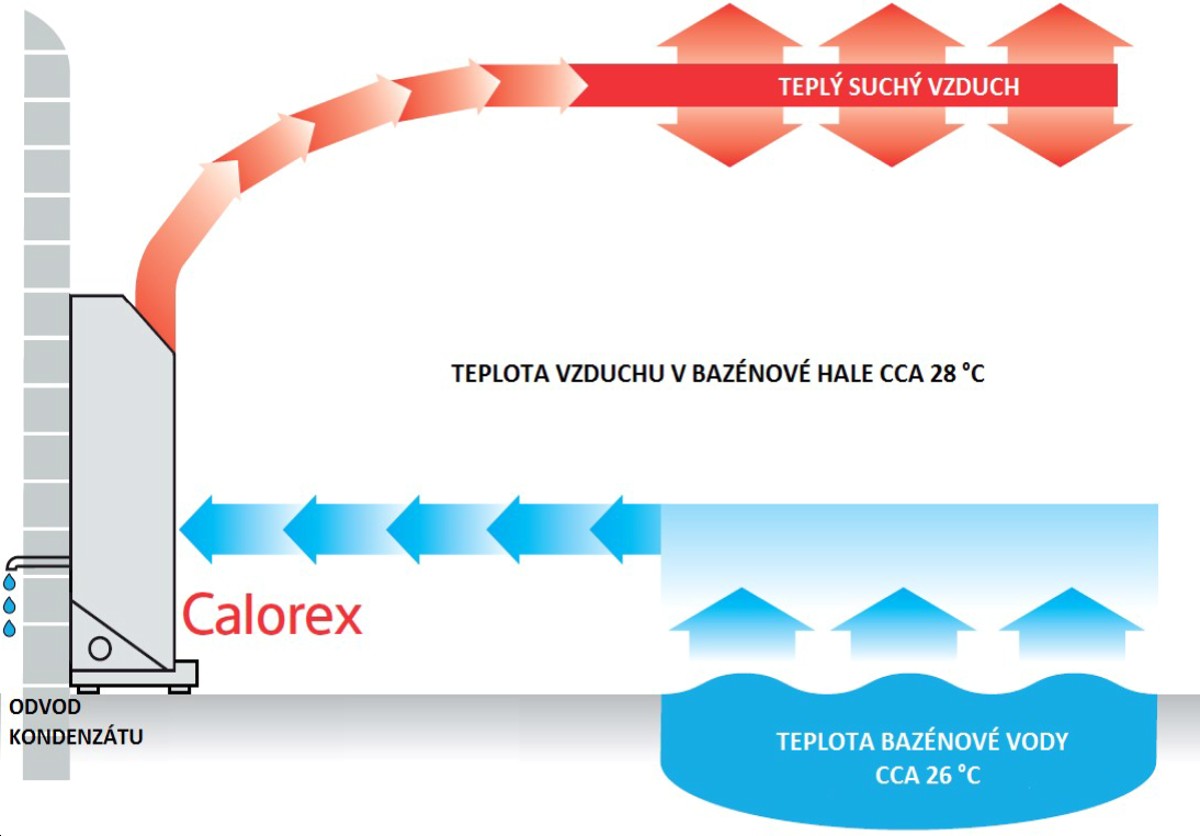 - vysoce účinné jednotky Calorex pracují na principu tepelného čerpadla, recirkulují vzduch, snižují jeho vlhkost a přivádí do prostoru bazénu zpět teplý vzduch