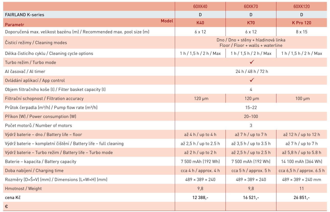 Bateriové automatické roboty FAIRLAND řady K jsou moderní automatické bateriové vysavače určené pro efektivní čištění privátních bazénů. Kombinují dlouhou výdrž baterie, inteligentní řízení pohybu a vysoký sací výkon, včetně zesíleného Turbo režimu pro odstranění hrubých nečistot. Ovládání je jednoduché, provoz plně bezkabelový a údržba rychlá díky snadno vyjímatelnému filtračnímu koši.