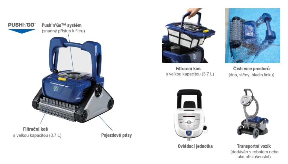 Pásový robot s filtračním košem. Čistí dno, stěny a hladinovou linku. Vhodný pro plastové a laminátové bazény.