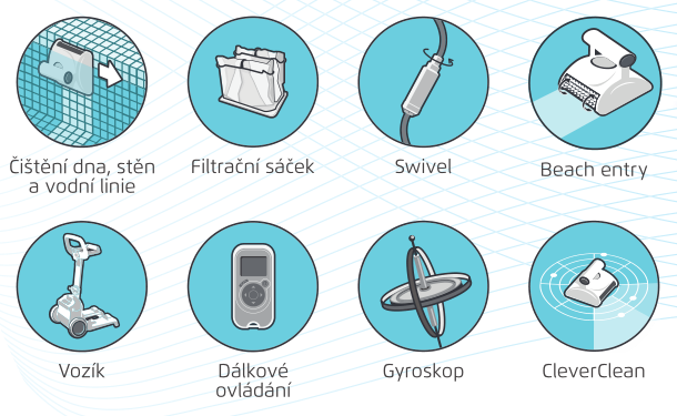 - Maximální hygiena - nová koncepce kartáčů díky, které jsou z bazénu sbírány nejen běžné nečistoty, ale i řasy a bakterie.