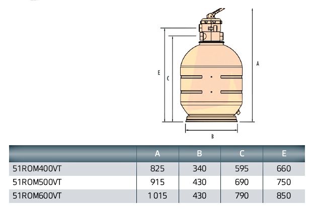 Filtrační nádoby ROMA jsou tvořeny jednolitým tělem z polythylenu s vysokou hustotou. 6-ti cestný ventil je umístěn na vrchu nádoby a je vybaven manometrem. Čerpadlo s nádobou jsou umístěny na plastovém podstavci.