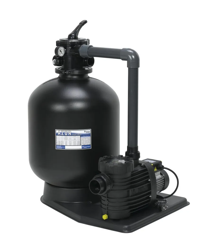 Písková filtrace Kit 380 je vybavena základovou deskou na níž je umístěna polypropylenová filtrační nádoba AZUR s 6-ti cestným top-ventilem s manometrem, samonasávacím čerpadlem Bettar Top 6 a propojovacím potrubím ∅50 mm.