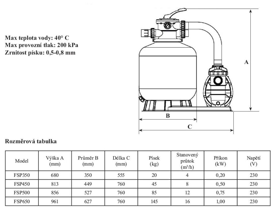 Písková filtrace FSP-500 je vybavena základovou deskou na níž je umístěna filtrační nádoba z polypropylenu opatřená 6-ti cestným top-ventilem s manometrem, šroubením na připojení lepením ø50mm (PUMP,RETURN,WASTE). Na základové desce je rovněž umístěno bazénové čerpadlo s vlasovým filtrem o výkonu 12m3/h, které je s filtrační nádobou propojeno flexi hadicí.