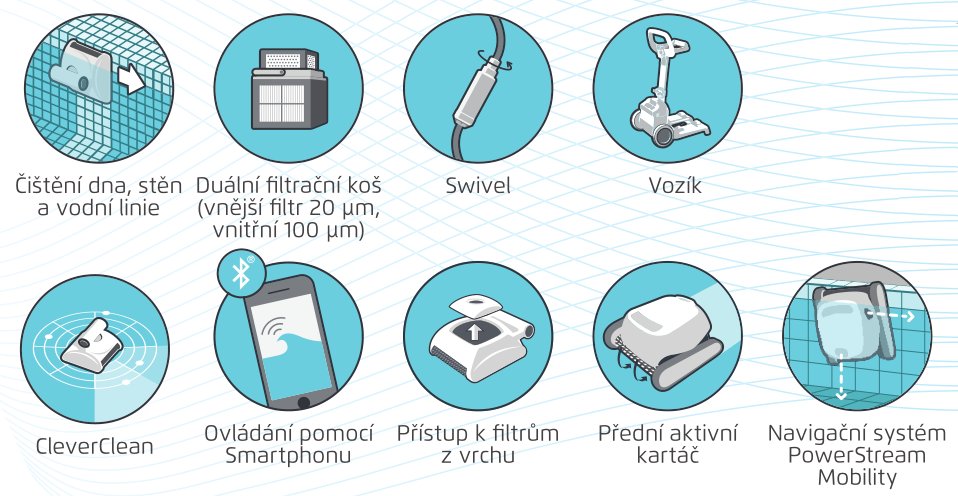 - Skenovací systém Advanced CleverClean a Gyroskop zajišťují dokonalé vyčištění bazénu. Vysavač je velmi flexibilní,a proto je vhodný pro všechny tvary a povrchy bazénů