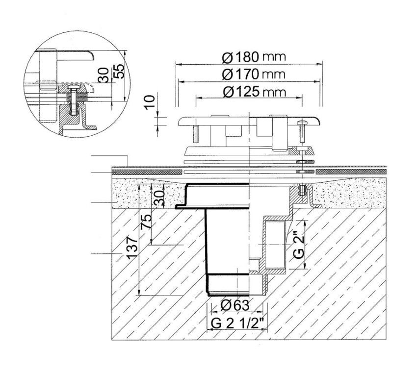 Připojení: R 2“ x 2,5“, 63 mm připojení lepením. Směr odtoku je 90° a 180°.