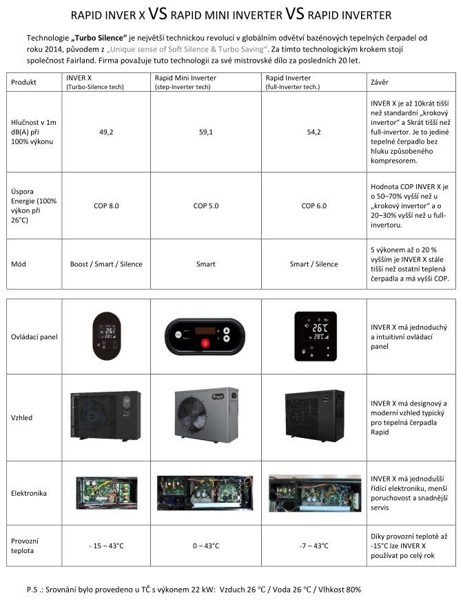 Rapid Inver-X je vybaven invertorovým kompresorem a motorem ventilátoru, díky čemuž je příkon i rychlost ventilátoru plynule regulována elektronikou dle aktuální potřeby. Velkou výhodou tohotosystému je rychlejší ohřev a udržování konstantní teploty vody, přičemž odpadají „studené starty“, které mají vliv na životnost jak komponentů tepelného čerpadla, tak i na zatížení elektrické soustavy. C.O.P. až 16,5 za ideálních podmínek není obchodním trikem, ale je doloženo certifikátem TÜV Rheinland. Tento typ tepelného čerpadla INVER-X nemá možnost CHLAZENÍ.