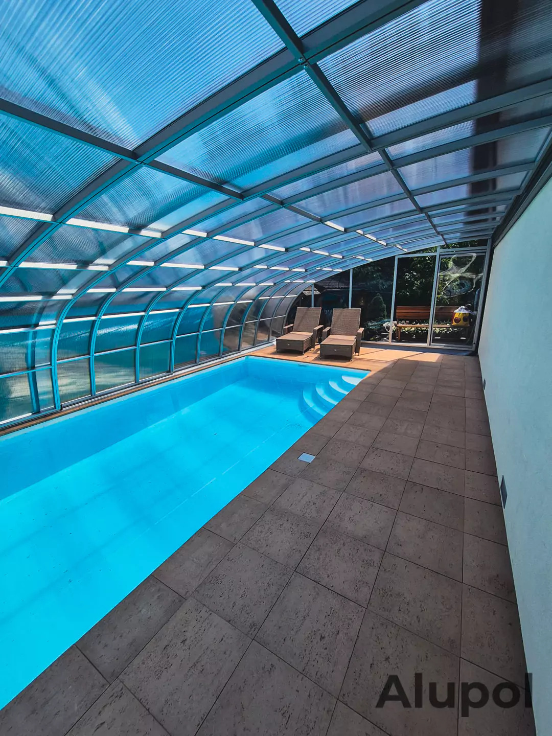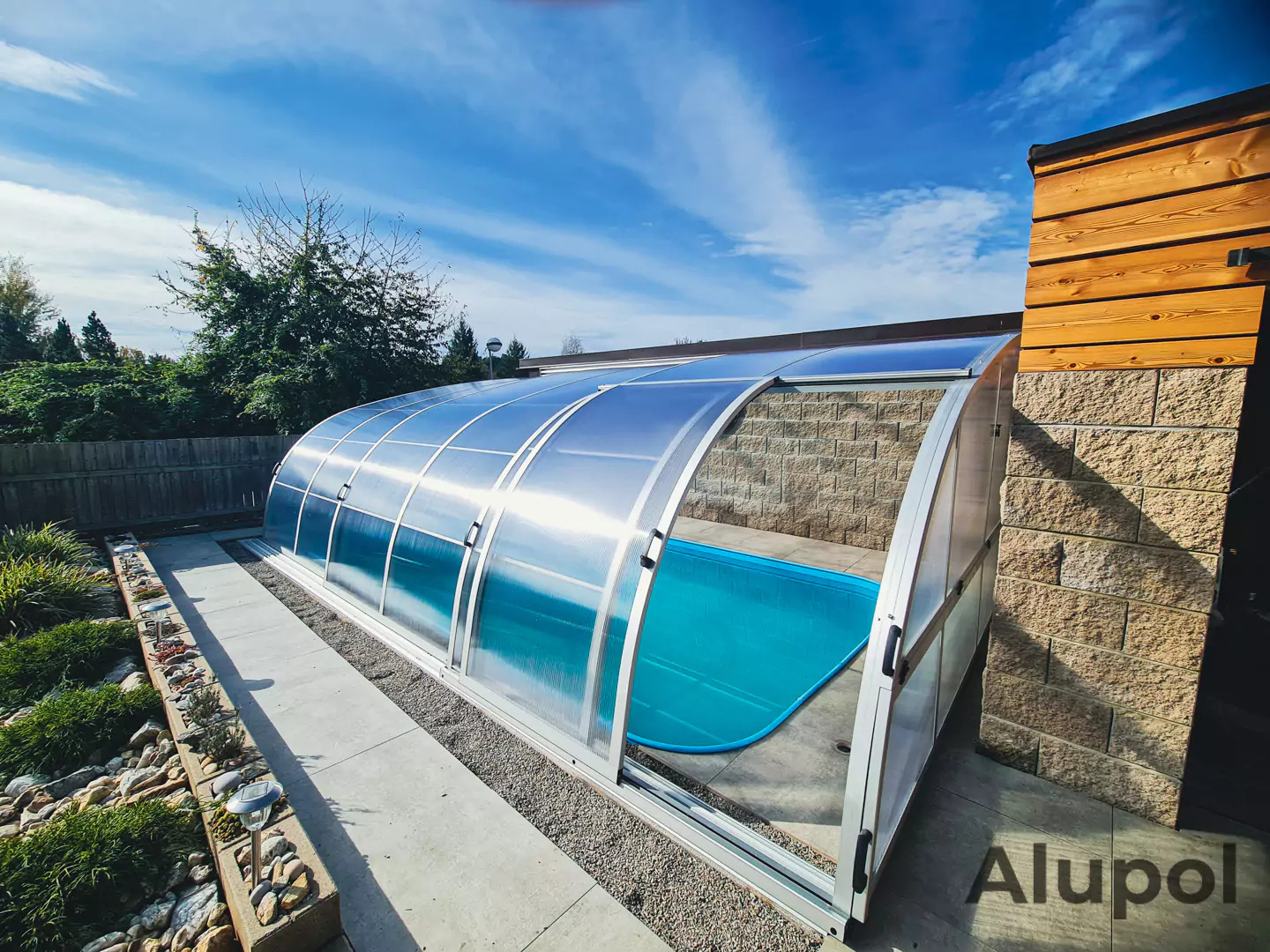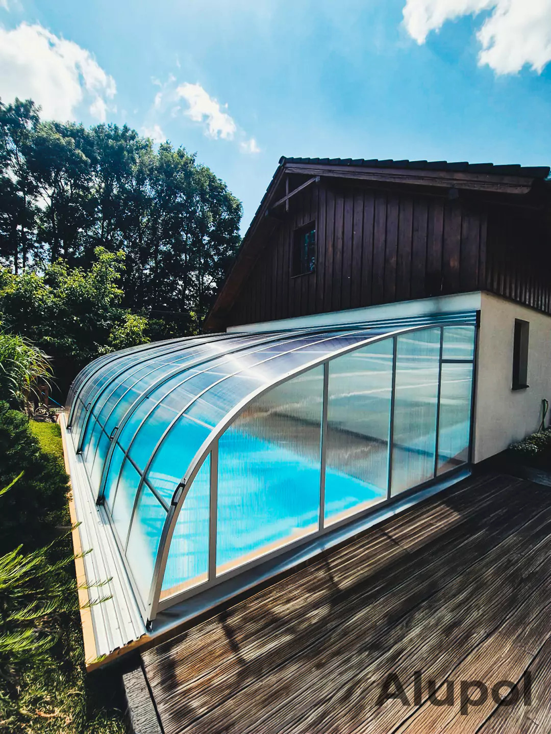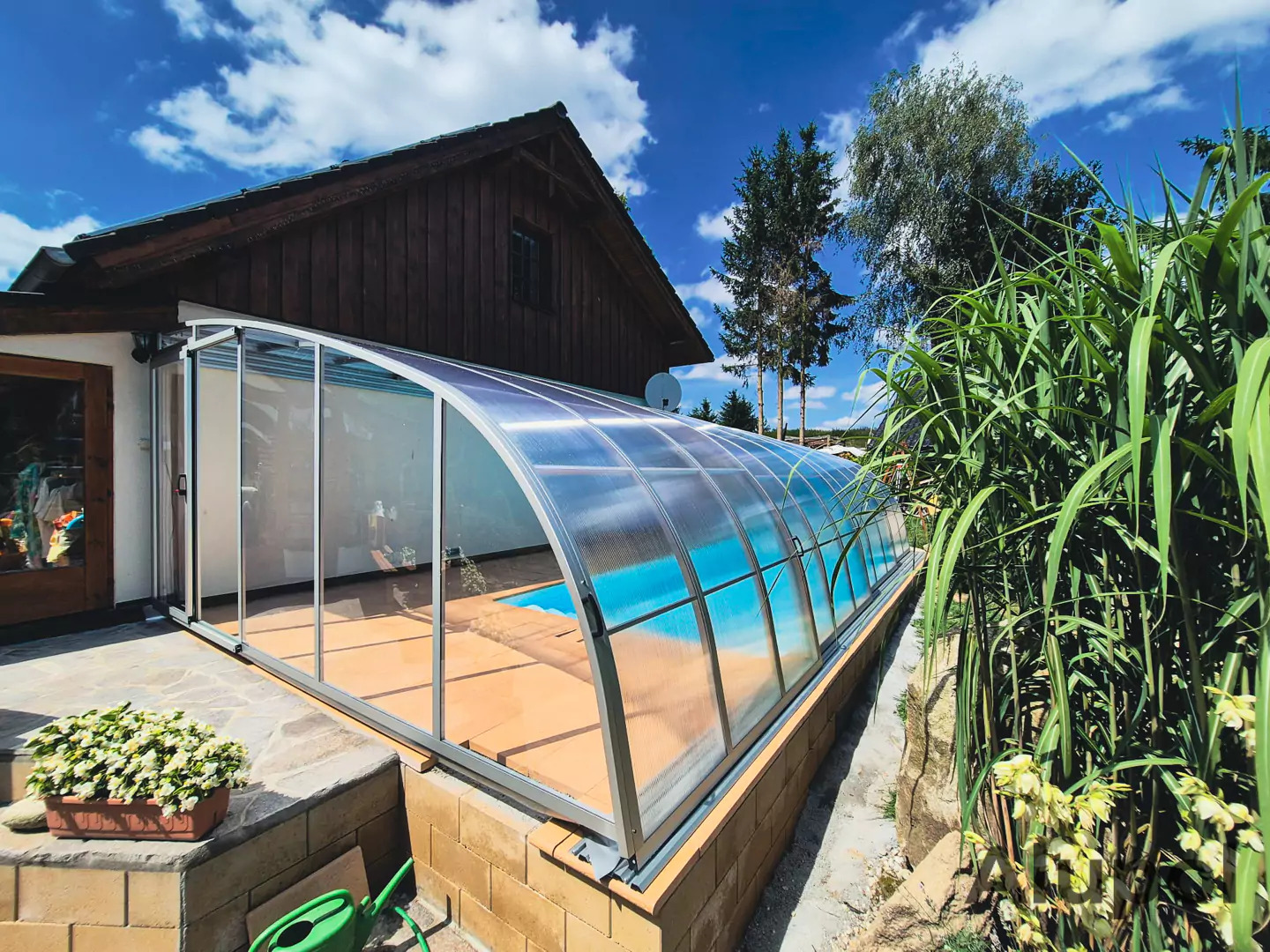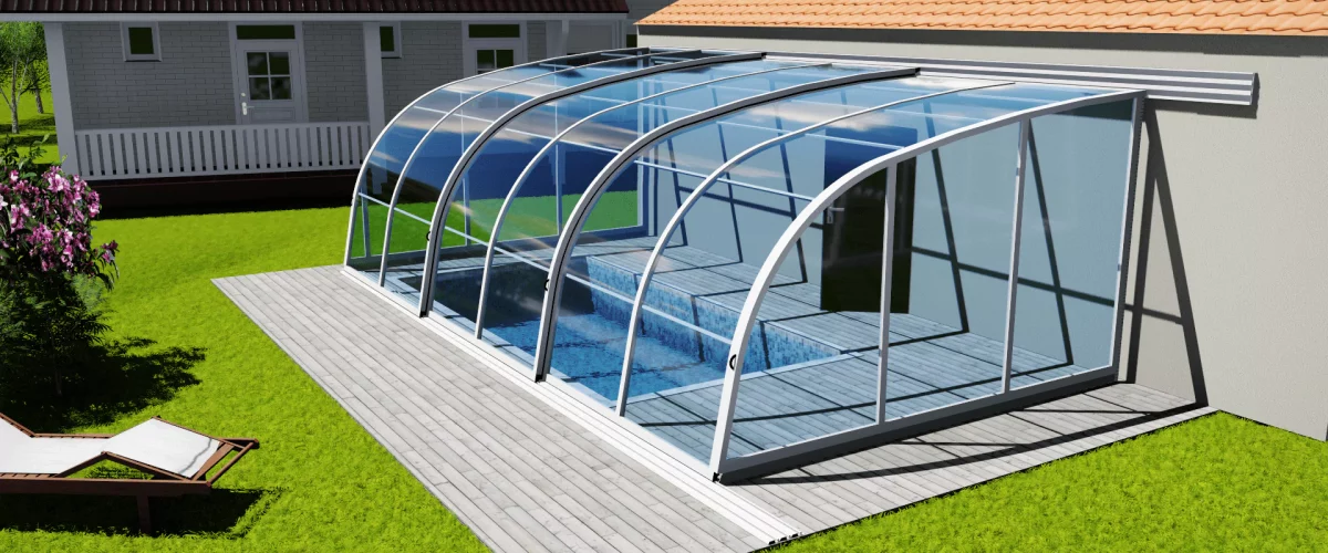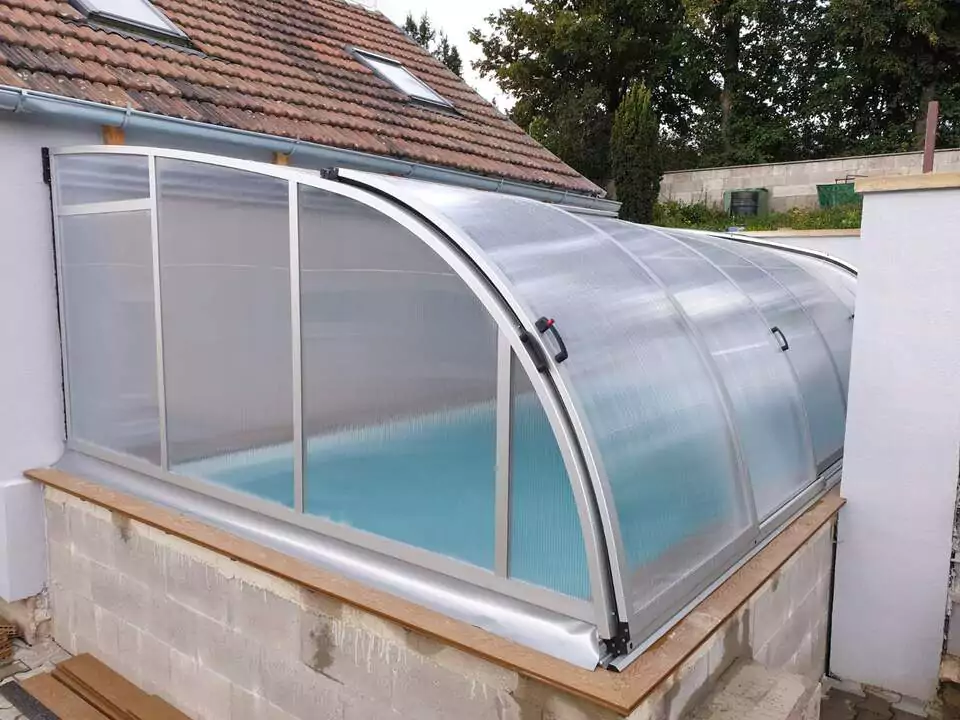 Je podchozí zastřešení s jednou kolejnicí na svislé zdi. To oceníte zejména, pokud chcete vycházet z domu do zastřešeného prostoru. Využijete tak prostor mezi stěnou a bazénem. Vzhledem ke konstrukci lze přizpůsobit výšku a snížit ji tak na minimum. Rozměry typu Sunset od nás obdržíte na individuální poptání.