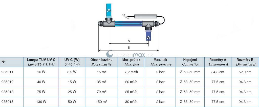 | Model | Max. průtok | Intenzita záření | Počet UV lamp: výkon | Napojení DN | Délka jednotky |