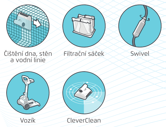 • Nová koncepce kartáčů díky které jsou z bazénu sbírány nejen běžné nečistoty, ale i řasy a bakterie